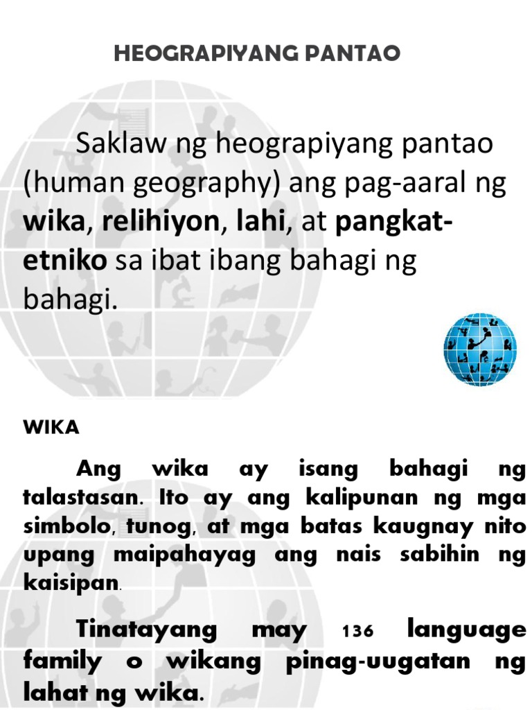 Saklaw ng Heograpiyang pantao human heography pag-aaral ng wika relihiyon lahi at pangkat-etniko sa ibat ibang bahagi ng daigdig. Ang Heograpiyang Pisikal. Gayondin ang pisikal o bayolohikal na katangian ng pangkat.