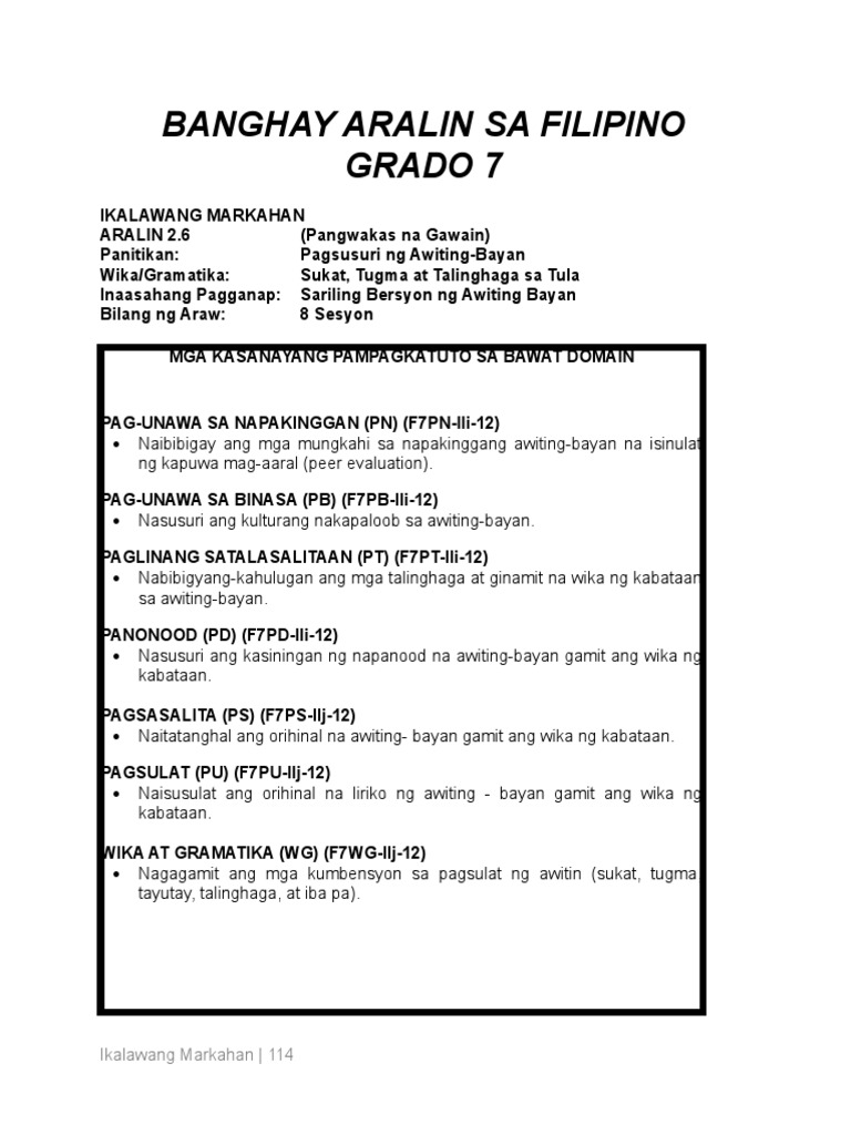 Gumawa ng awiting bayan tungkol sa pag-aaral sa gitna ng pandemya. Apit dukha kinalinga lahat pinagpala. Instrumento sa pakikipagtalastasan at midyum sa pagpapahayag paglinang at pagpapalaganap ng kultura.
