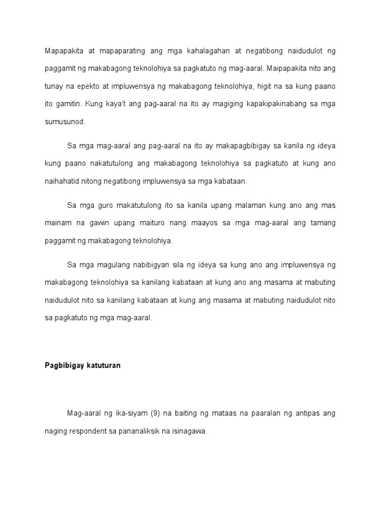 Mayroon ding mga bahagi na makapagbibigay-ambag sa napapanahong mga isyu partikular na sa larang ng Edukasyon. Talahanayan 6 Epekto ng teknolohiya sa pag-aaral ng mga mag-aaral Mga teknolohiya Mean Deskripsyon Cellphone 504 Di-gaanong mababa Kompyuter 501 Di-gaanong mababa Telebisyon 5 Di-gaanong mababa Inilahad sa talahanayan 6 ang epekto ng. EPEKTO NG PAGGAMIT NG KOMPYUTER SA AKADEMIK PERPORMANS NG MGA MAG-AARAL SA TAONG 2014-2015 Isang Pananaliksik na Iniharap sa Kagawaran ng Filipino St.